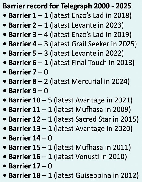 Exactly that happened in last year’s Telegraph when Platinum Attack started from the outside gate of 11 and lost his cover across the junction when shunted wide, sprinting hard but only managing to get within 4.6 lengths of winner Grail Seeker.