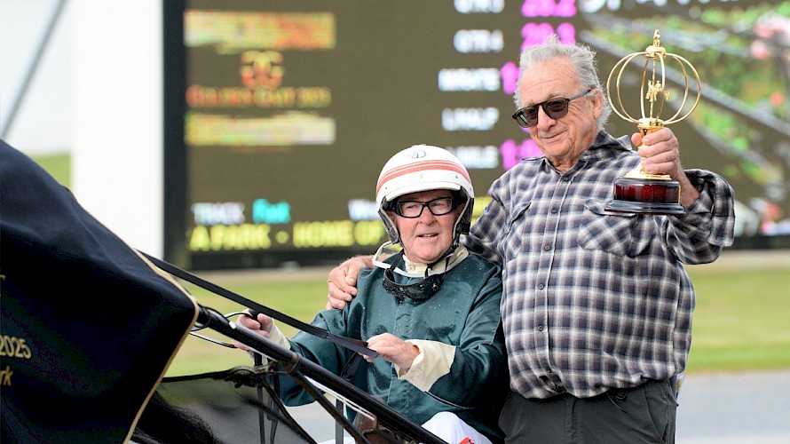 Ray Green holds the Golden Trophy after Tyson’s last, and biggest, win at Auckland. PHOTO: Therese Davis/Race Images.