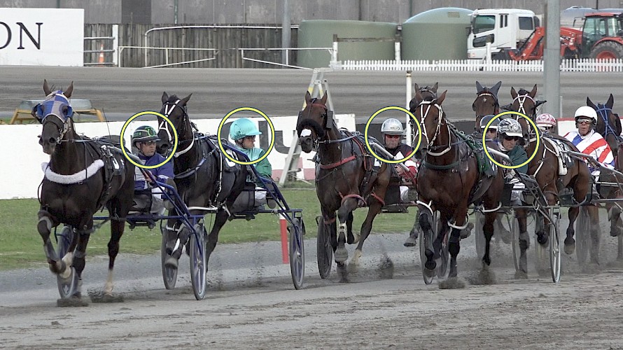 In the photo above you can see Lincoln Wave’s driver Tony Herlihy looking down at his wheel, inside him Peter Ferguson on Dave Duley looks across and up ahead both leader Andre Poutama on Rushkinoff and trailer Zachary Butcher on Chanel Noire turn around in surprise.