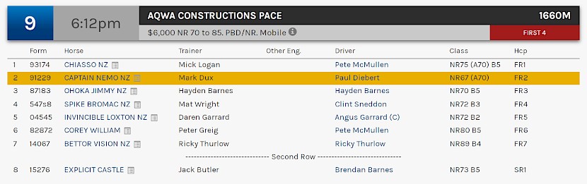 Captain Nemo is the lowest rated pacer in the rating 70 to 85 event, plan B for Dux after two easier races he was entered for were canned.