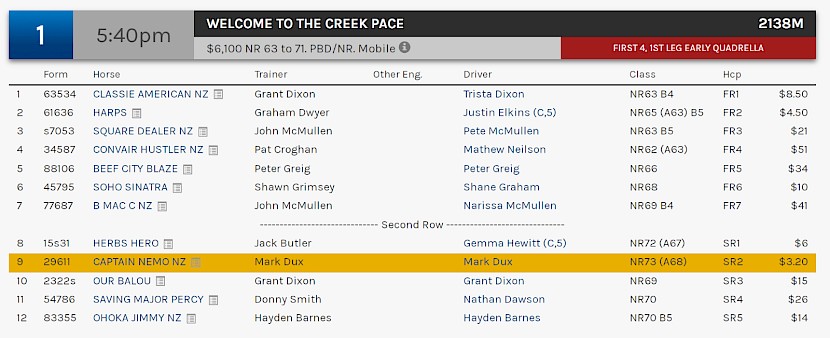 Trainer Mark Dux gets Captain Nemo home for back-to-back wins at Albion Park last week. PHOTO: Dan Costello.Captain Nemo, who races in the opener at the Creek on Friday night, is also well in his rating 63 to 71 race as the highest rated in the field.