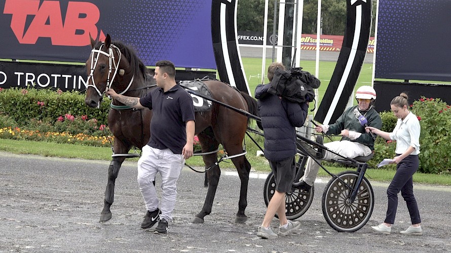 Maurice McKendry being interviewed after winning behind Lincoln Wave at Auckland.