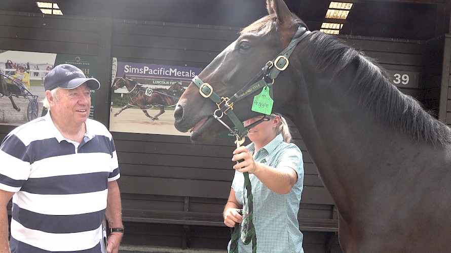 Ray Green gets to know one of his new yearlings, a cheap American Ideal colt, Whiz On Bye.Green has taken an early fancy to his two fillies also - Nirvana Franco (Bettor’s Delight - Nearea Franco) came with a $100,000 price tag and Major Grace (Art Major - Zariya) cost $48,000.
