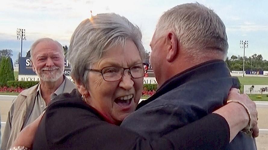 The late Margaret Rabbitt hugs Lincoln Farms’ business manager Ian Middleton after one of her many wins at Alexandra Park.