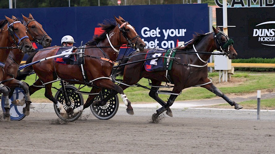 Lincoln Lover sprints up the passing lane to beat Katies Princess at Cambridge. PHOTO: Katie Steffert/Race Images.